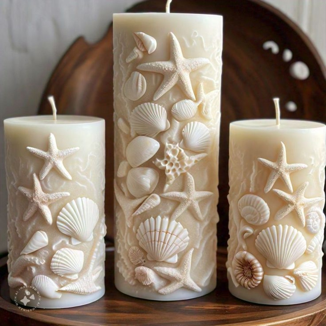 Plus qu’une simple bougie, cet objet est une véritable sculpture de cire. Chaque bougie pilier est minutieusement décorée de coquillages et d’étoiles de mer en relief, créant un jeu de textures fascinant. Parfaites pour décorer une salle de bain ou créer un centre de table, elles apportent une atmosphère chaleureuse même sans être allumées.