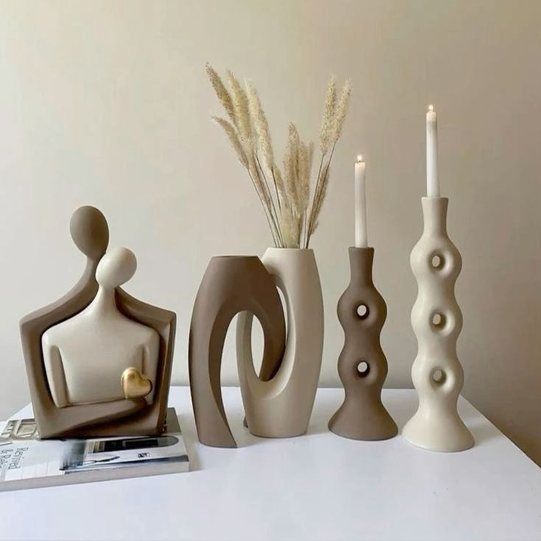 Créez une ambiance sereine et sophistiquée avec cet ensemble de pièces décoratives en céramique. Il comprend une sculpture de couple, des vases aux lignes fluides et des bougeoirs au design original. Les couleurs neutres et les finitions mates s’intègrent parfaitement dans les intérieurs modernes ou scandinaves. À disposer ensemble ou séparément pour distiller des touches d’élégance.