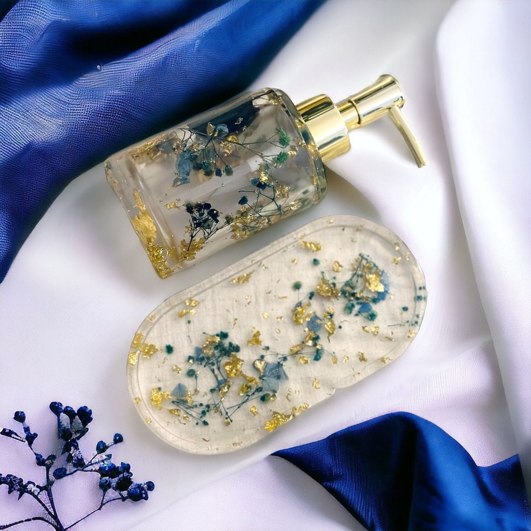 Cet ensemble duo, comprenant un distributeur de savon et un plateau/vide-poche assorti, apporte une touche d’élégance à votre salle de bain ou lavabo. Des fleurs séchées d’un bleu profond et des éclats de feuille d’or sont figés dans la résine transparente, créant un contraste saisissant et raffiné.