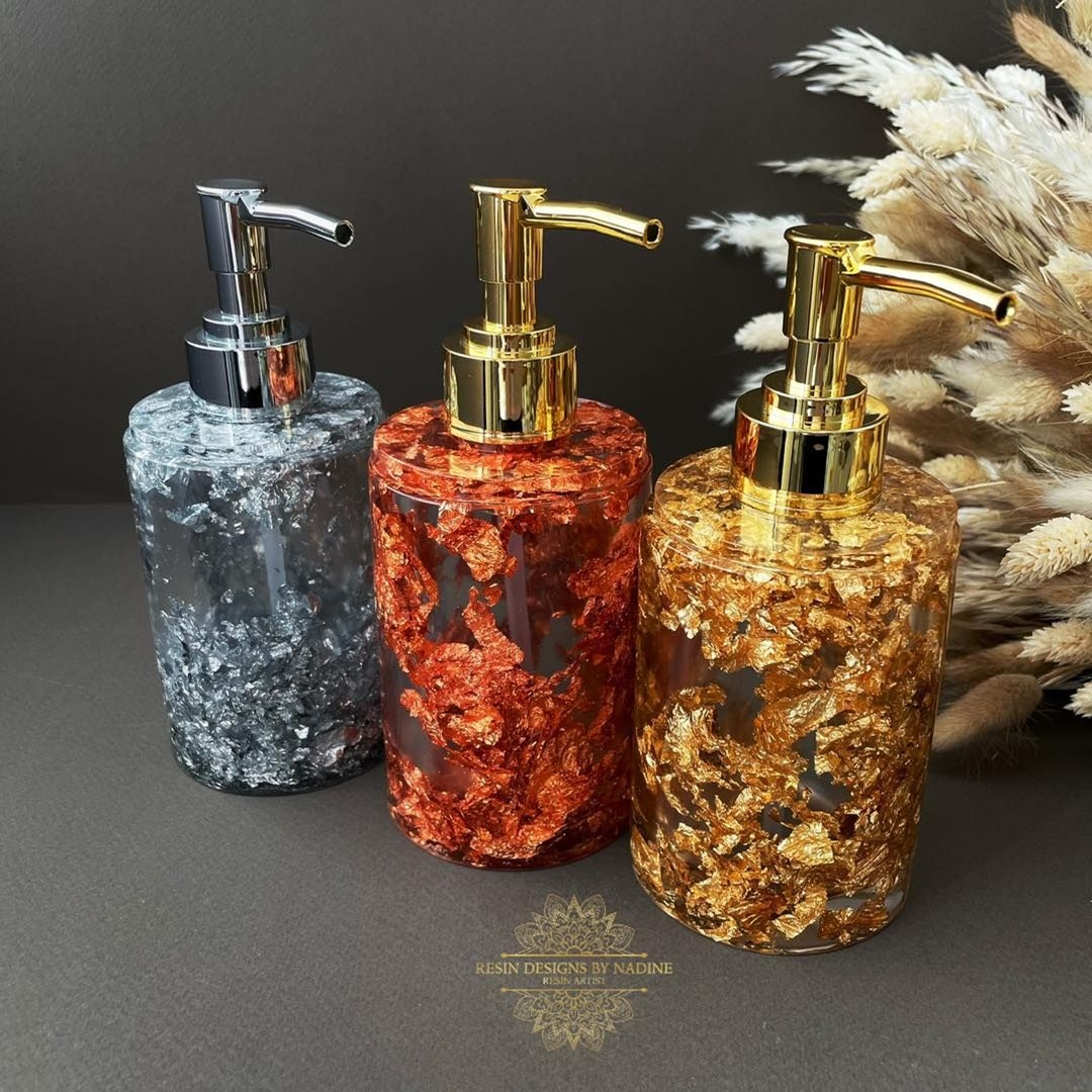 Un design audacieux et glamour pour ces distributeurs de savon en résine, remplis d’éclats métalliques pour un effet spectaculaire.