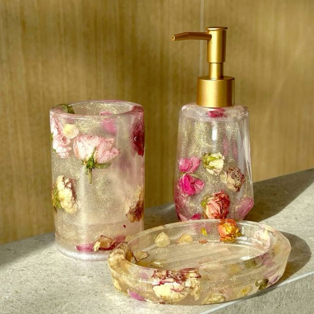 Une touche de romantisme pour votre salle de bain avec cet ensemble en résine incluant de véritables boutons de rose séchés.