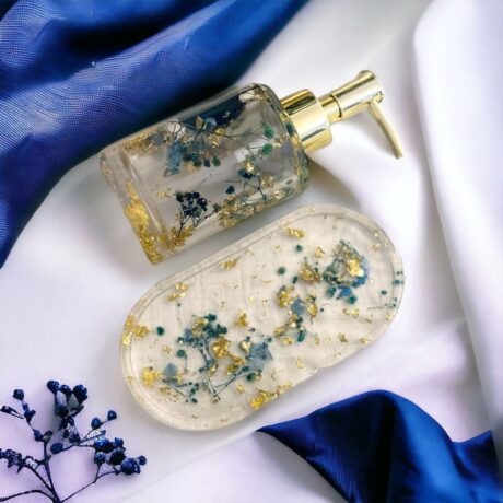 Le set de bain Luméa est une invitation à la détente dans un cadre chic et lumineux. Cet ensemble artisanal complet en résine transparente est délicatement parsemé de feuilles d’or, offrant un équilibre parfait entre modernité et opulence. Il se compose de cinq pièces magnifiquement coordonnées :